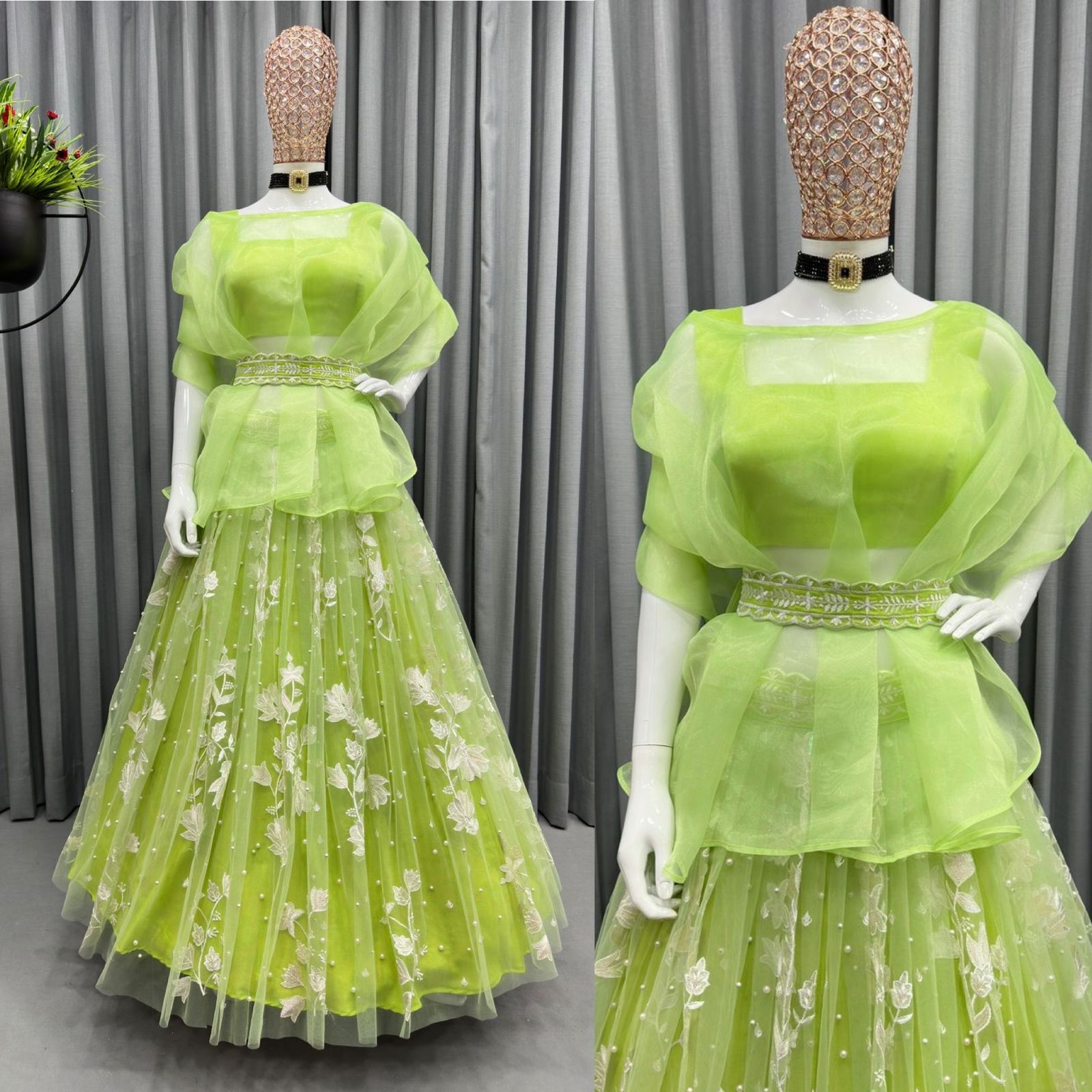 Beautiful organza silk pistachio lehenga for women, bridesmaid lehenga with shrug,sequin embroidery lehenga with rivet moti work for wedding