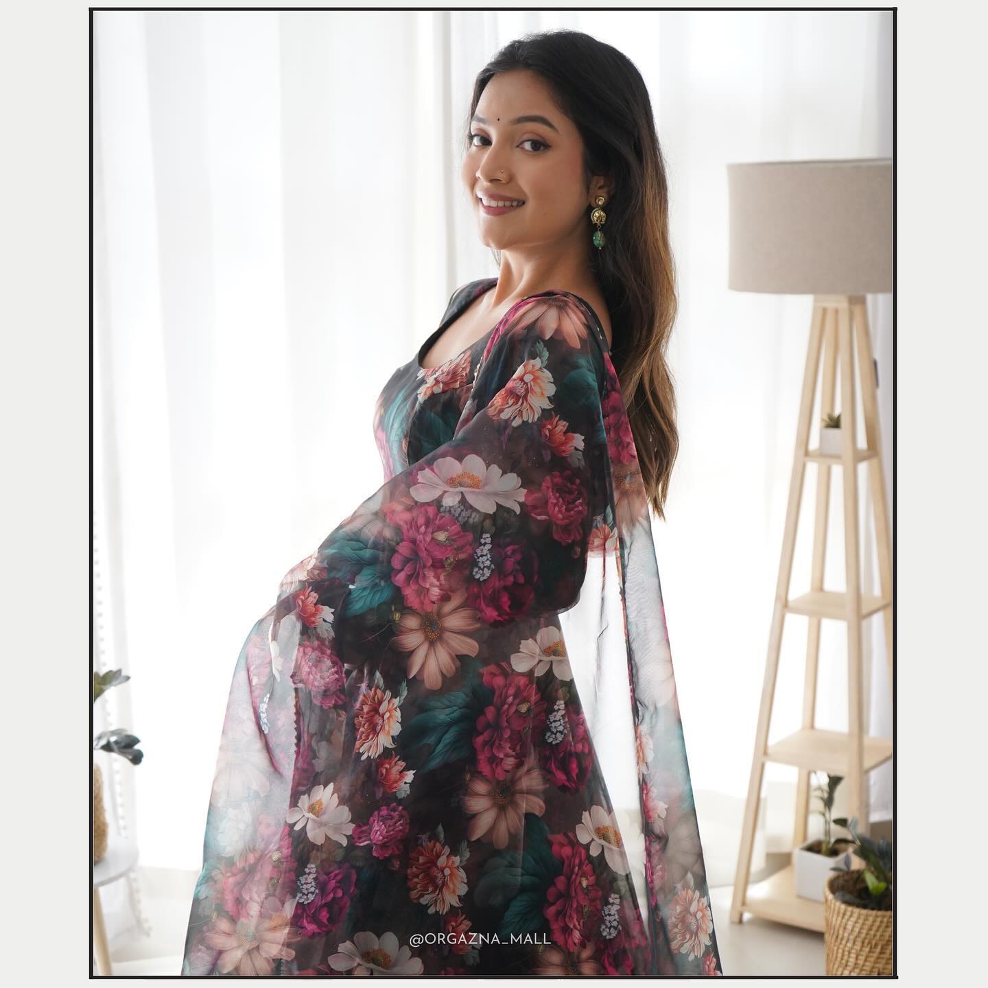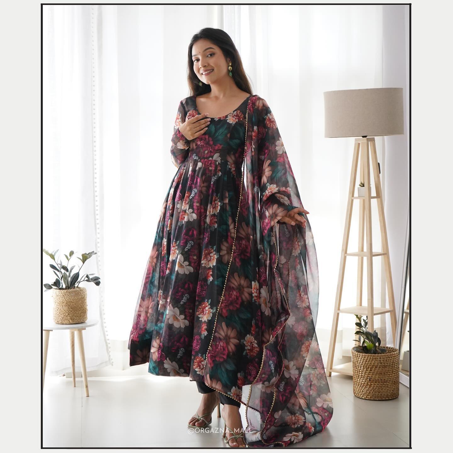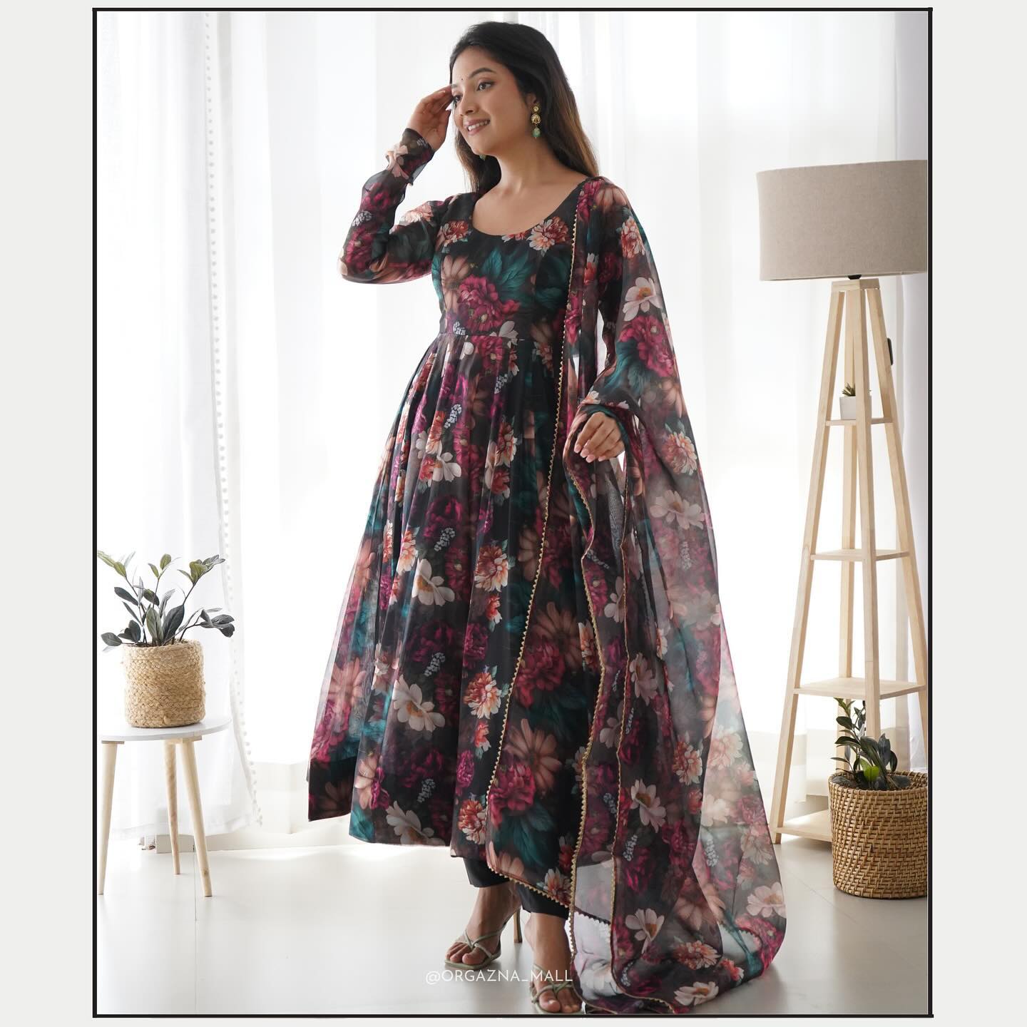 Name : Black Women Printed Organza Gwon Kurta With Dupatta