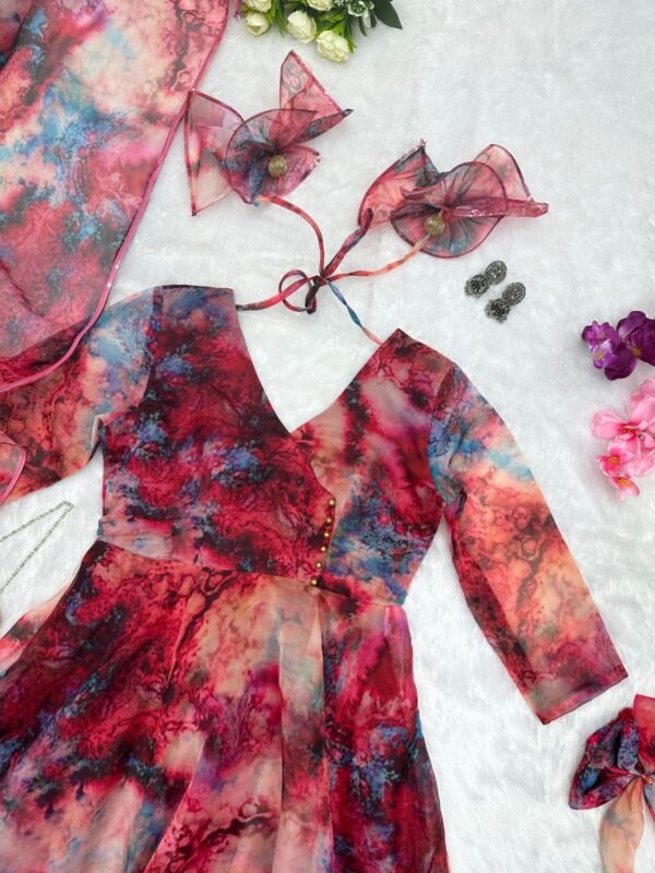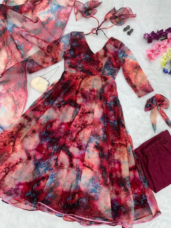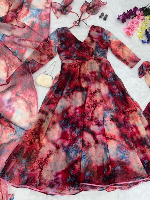 Name :- Digital Printed Pure Organza Silk Anarkali Suit Of Huge Flair With Lace BorderFabric. Organza Silk