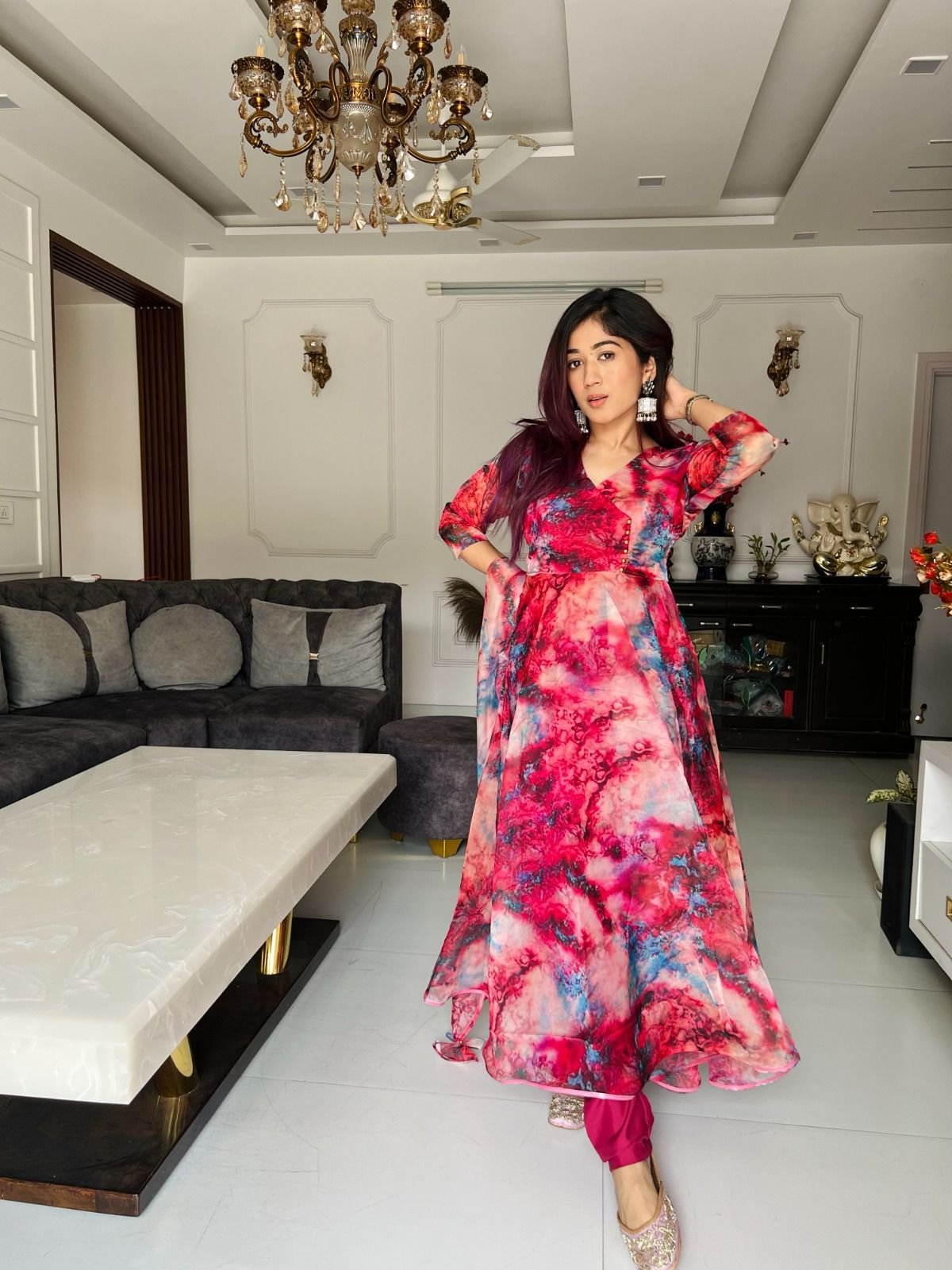 Digital Printed Pure Organza Silk Anarkali Suit Of Huge Flair With Lace Border