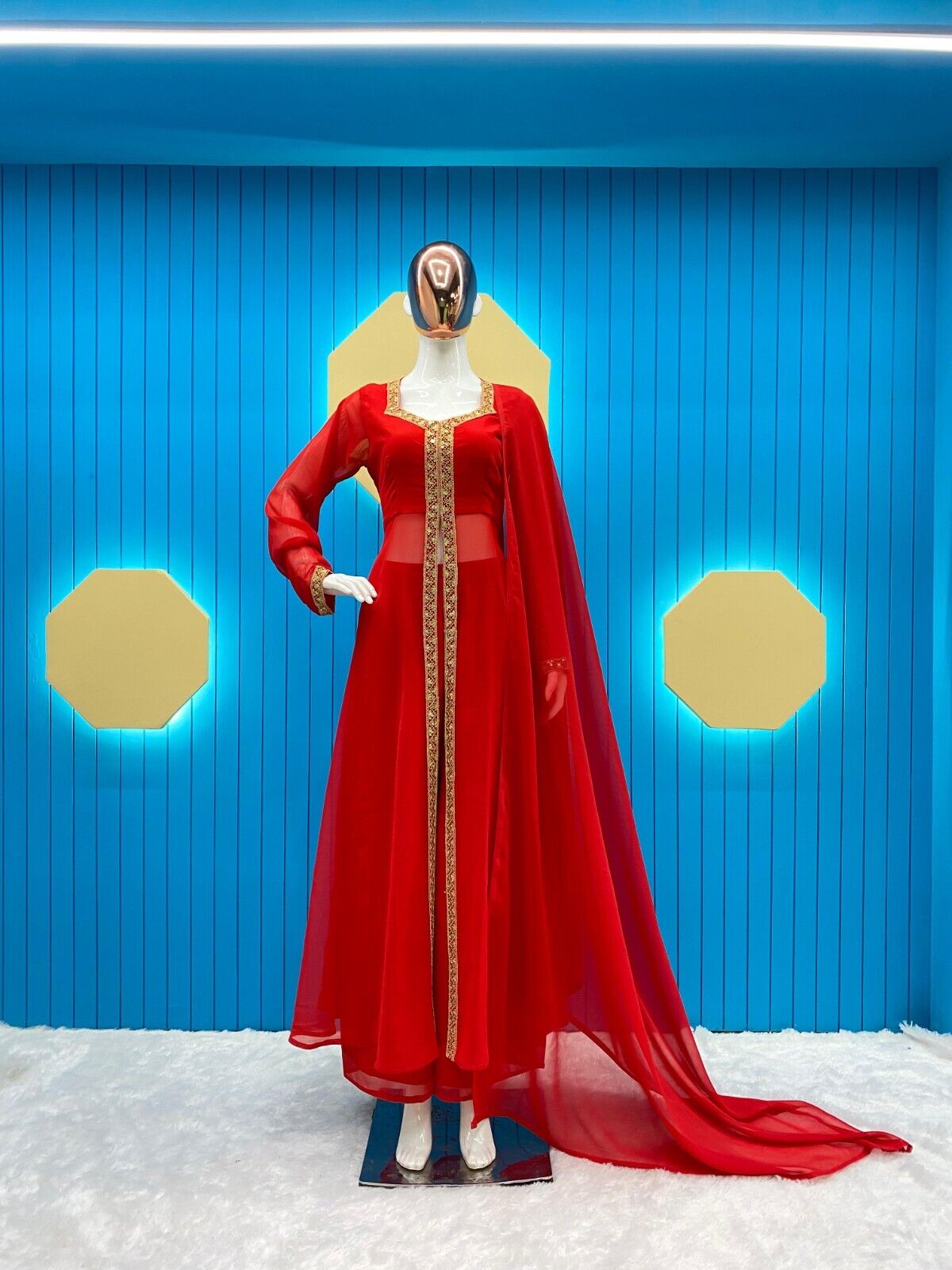 The Red Kurta Set For Karwa Chauth With Beautiful Lace Border Is A Resplendent Outfit Crafted To Enhance The Elegance And Grace Of The Karwa Chauth Celebration. Fashioned From Exquisite Georgette Fabric In A Vibrant Shade Of Red, The Kurta Embodies The Festive Spirit Of The Occasion. It Is Adorned With Intricate Embroidery And Sequin Work, Imparting A Delightful Sparkle And Charm. The Inner Crepe Lining Ensures Comfort Throughout The Day, And The Size Options, Extending Up To 44 Inches, Cater To Various Body Types. Accompanying The Kurta Is A Matching Micro Cotton Bottom, Seamlessly Complementing The Ensemble With Its Rich Red Hue. A Generous Georgette Dupatta, Boasting A Length Of Up To 2.25 Meters, Provides Versatility In Styling And Adds A Touch Of Regal Beauty. This Ensemble Is The Perfect Choice To Celebrate Karwa Chauth With Traditional Elegance And Flair, Making It A Memorable And Cherished Occasion.