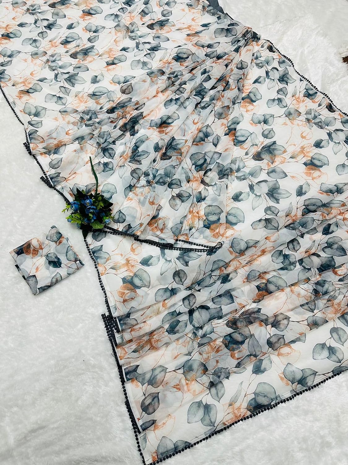 Saree For Women's And Girls Georgette With Digital Prints & Fancy Lece Work White Color Ready To Wear Saree