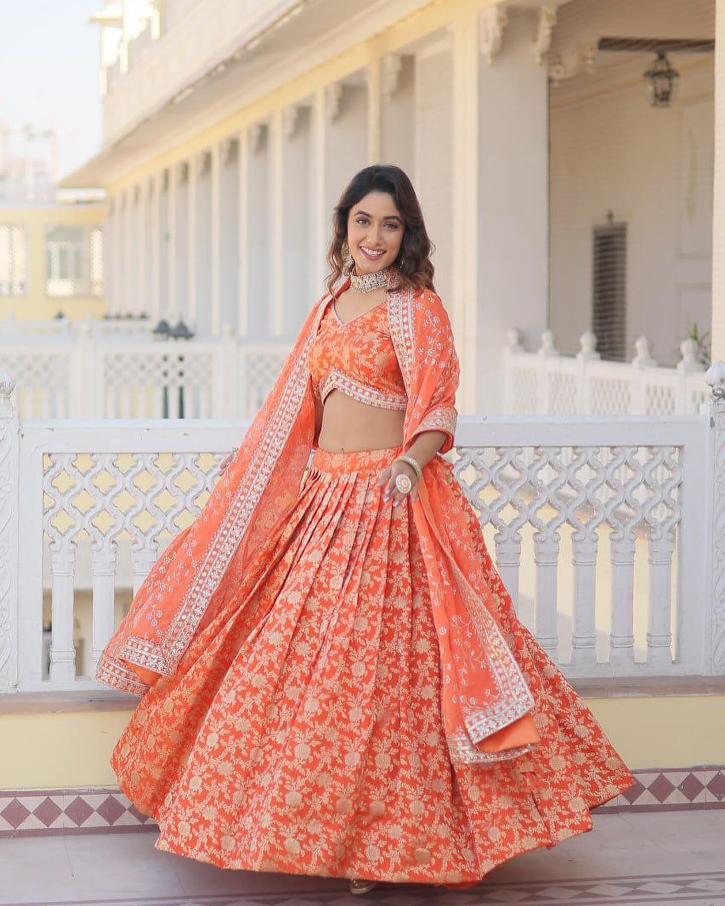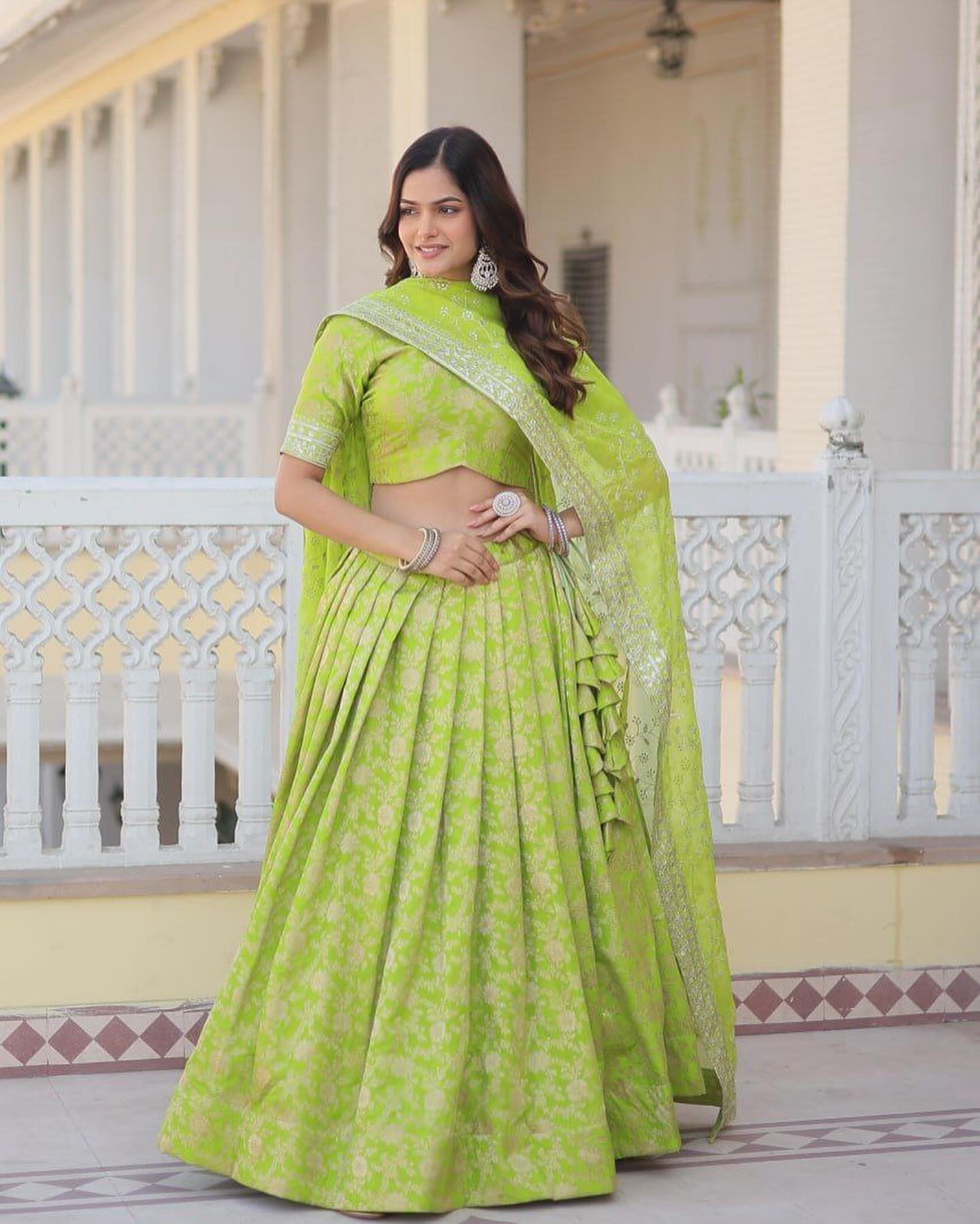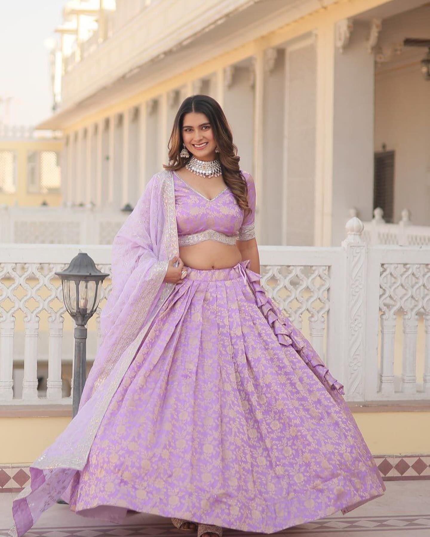 The Lehenga Is Fully Stitched And Made Of High-quality Pure Dyable Viscose Jacquard Fabric. It Is Embellished With Intricate Embroidered Sequins Work, Adding A Touch Of Glamour. The Length Of The Lehenga Is 42 Inches, And The Waist Measures 42 Inches, Providing A Comfortable Fit. The Inner Lining Of The Lehenga Is Made Of Cotton For Added Comfort. It Has A Flair Of 3.5 Meters And A Closure With A Chain Attached And A Dori Latkan. The Stitching Type Includes A Stitched Can-can For Enhanced Volume And Structure.